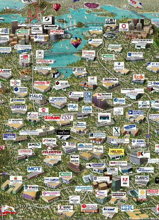 Ribuan perusahaan teknologi berdiri dan berkembang pesat di Silicon Valley. Yang terkenal seperti Hewlett Packard, Intel, eBay, Cisco Systems, Apple, Google, Yahoo, Symantec, Oracle, SanDisk, Adobe Systems dan Nvidia.