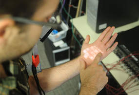 Perangkat Skinput yang dikaitkan di lengan pengguna, mampu mendeteksi level suara yang terjadi kala kulit ditekan, sehingga mampu membedakan perintah yang diberikan. Sebuah proyektor mungil menampilkan layar di kulit pengguna.